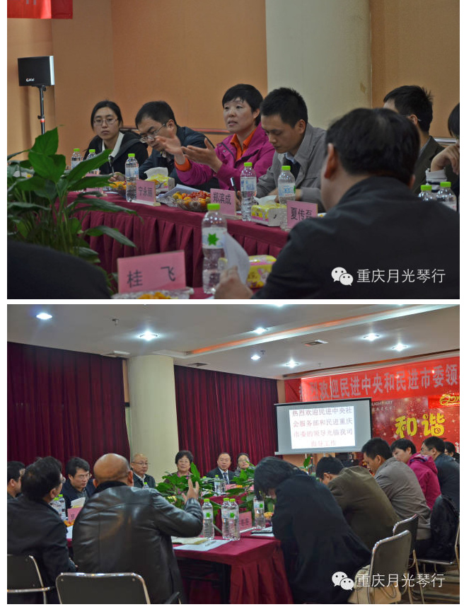 在座谈交流会上,领导们在交流各自工作的基础上针对社会服务、文化产业、企业发展等关键点展开了热烈的讨论。宁永丽秘书长热情洋溢的分析工作状况,张克敏专职副主委满腔热枕的点明工作重心,陈贵云副主席温和沉稳的总结改进方向......大家各抒己见,慷慨激昂。其中,王礼全董事长汇报了近几年在发展企业的同时做的社会服务公益事业:捐赠云阳县青山村的“同心路”建设、赞助留守儿童“中国梦少年强”慈善捐款、支持教育事业等先后为云阳、武隆、永川、贵州金沙县等地慷慨捐款或捐琴,得到了民进中央、民进重庆市委、民进江北区委等领导的高度肯定与赞赏。